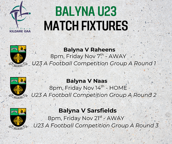 Best of luck to the Balyna U23s team and management in their upcoming fixtures against Raheens, Naas and Sarsfields.